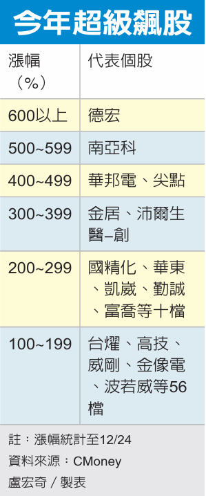 2021年经济逐渐启封,加上疫后库存抢补带动涨价、缺货潮,在当年长荣 (2603)、阳明、万海等「航海王」领军下,台股续涨3,486点或23.6%,最高来到18,291点,收18,218点,连三年涨二成以上,且都收在历史新高。