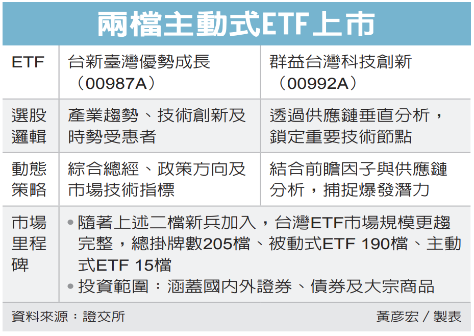 主动式ETF添新兵,两档新商品加入战局。台湾证券交易所表示,主动台新优势成长(00987A),以及主动群益科技创新(00992A),将于今(30)日挂牌上市,并得办理融资融券。