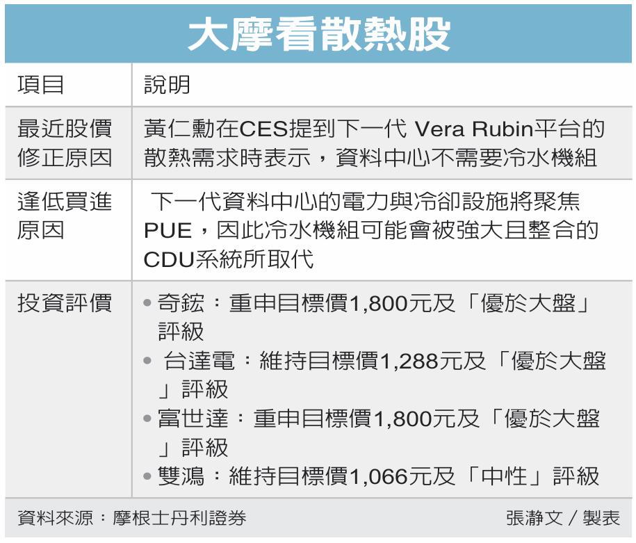 大摩指出,黄仁勋在美国消费电子展(CES)主题演讲,提到下一代Vera Rubin平台散热需求时表示,资料中心不需要冷水机组。这可能是台湾散热族群股价快速修正的原因。