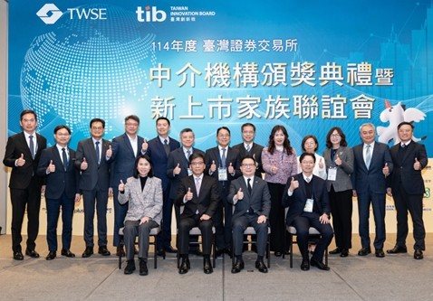 为增进新上市公司与中介机构及证交所之互动交流,并表扬证券承销商及签证会计师、委任律师推动国内外优质企业上市对资本市场之贡献,证交所于1月8日举办「114年度中介机构颁奖典礼暨新上市家族联谊会」,邀请金融监督管理委员会彭金隆主委及证券期货局黄仲豪副局长莅临指导,并与主办单位证交所林修铭董事长及李爱玲总经理共同颁奖。