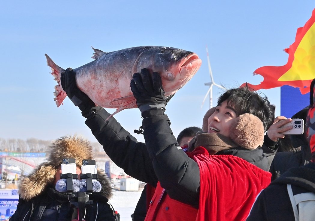 吉林·查及湖第24届冰雪渔猎文化旅游节8日开幕,数万中外游客到场见证「冰湖腾鱼」冬捕奇观。备受瞩目的「头鱼」在拍卖中以169万9999元(人民币,单位下同,约合新台币767万元)成交,将现场气氛推向高潮。