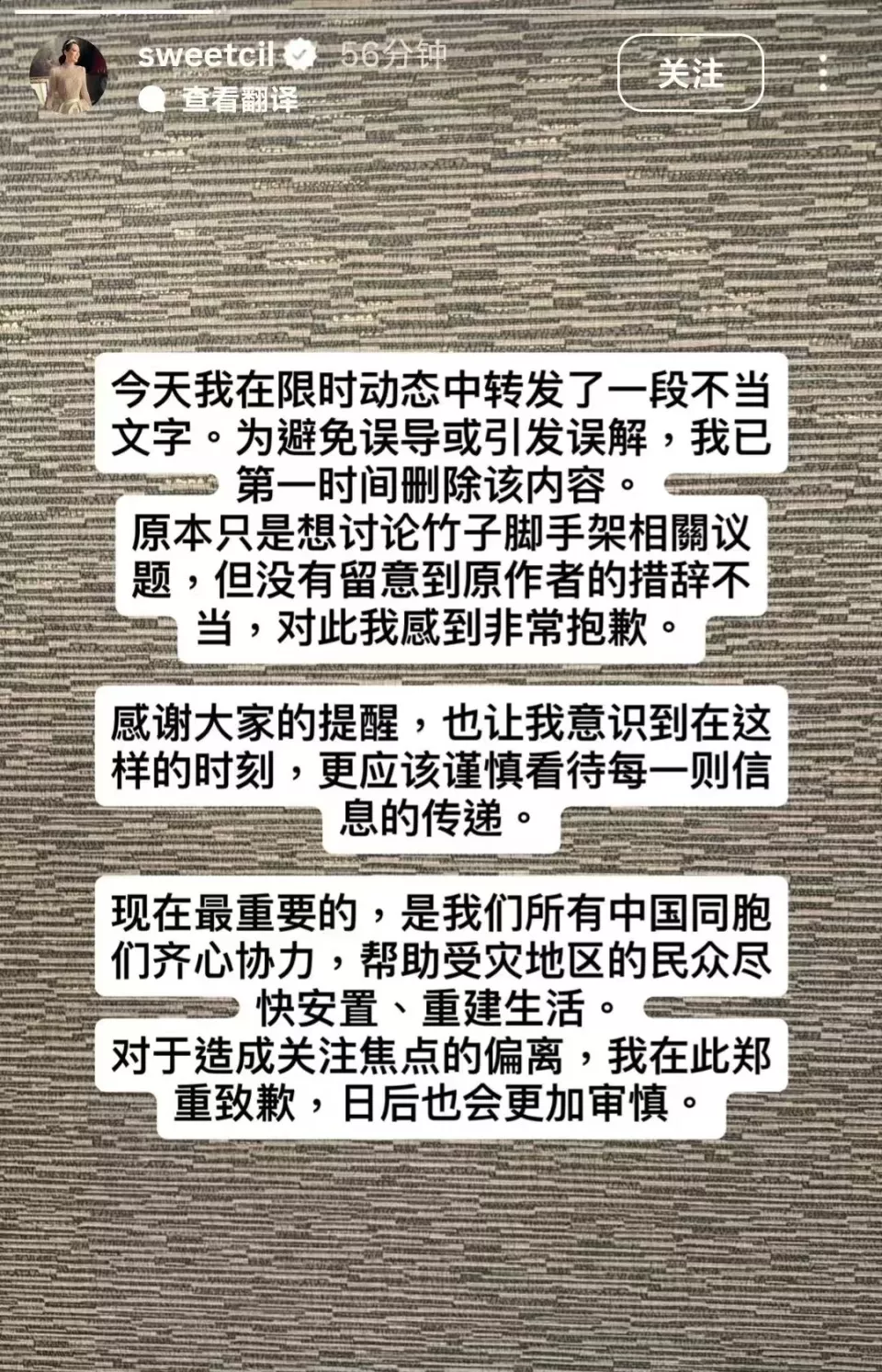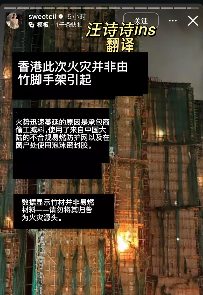 结果有些明星不仅没有第一时间捐赠,还发文挑事。甄子丹老婆汪诗诗就在火灾发生后,转发了一条英文INS,说竹材不是易燃材料,火灾蔓延是别的原因,甚至直接甩锅起来,令人震惊。