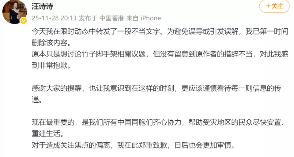 惹来争议之后,汪诗诗才姗姗来迟,发微博道歉,她称已第一时间删除该内容:“原本只是想讨论竹子脚手架相关议题,但没有留意到原作者的措辞不当,对此我感到非常抱歉。”、“对于造成关注焦点的偏离,我在此郑重致歉,日后也会更加审慎。”