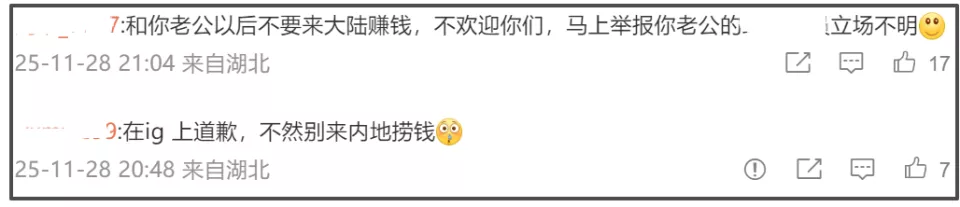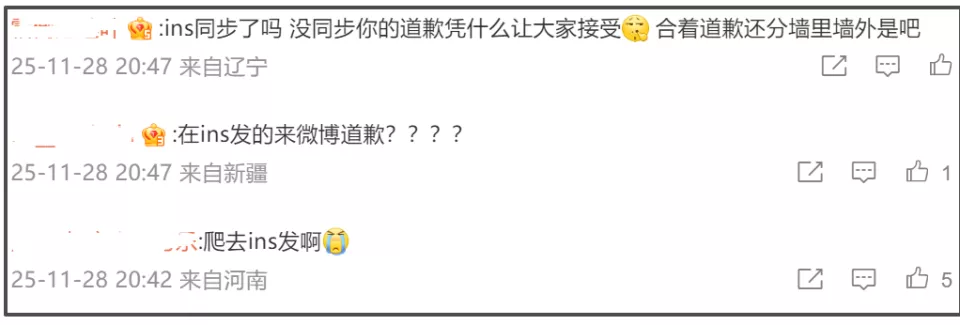汪诗诗发完微博后,网友并不买账,怒斥她微博特供道歉,不敢发在INS上,然后汪诗诗才发了同款道歉文案到INS。