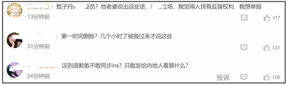 汪诗诗这一波无脑操作可以说彻底令网友失望,她道歉评论区根本控不住,网友的怒气值都快溢出屏幕了,有不少网友质疑汪诗诗的立场,同时连带着甄子丹也被质疑,甚至有不少网友想举报了。