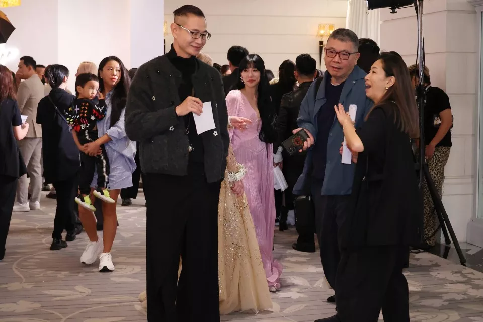 王阳明蔡诗芸夫妻穿着隆重,看得出来是当重要晚宴来对待,两人的服装颜色上也很用心搭配,一白一金,并用对方的颜色点缀细节,很“老钱风”。