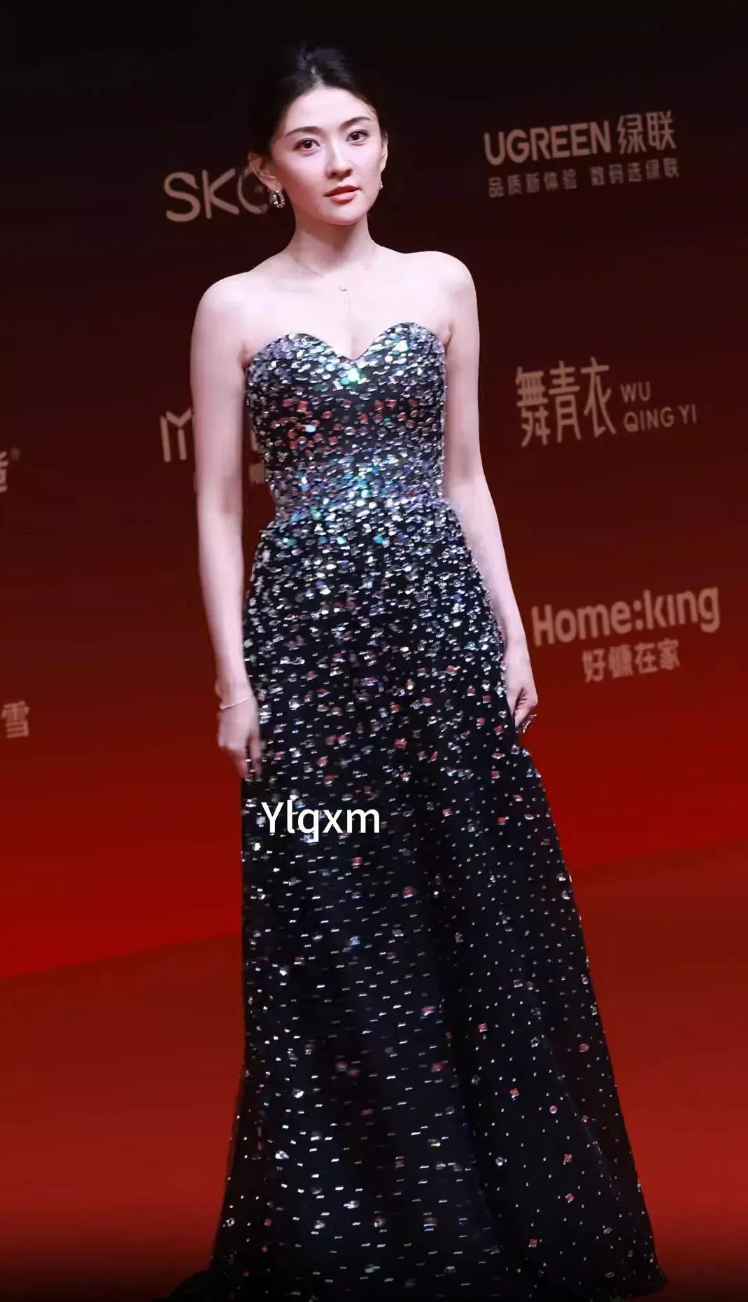梁洁穿了一条缀有银色亮片的黑色长裙,款式虽然简单,但胜在在闪光灯下会有闪闪发光的效果。