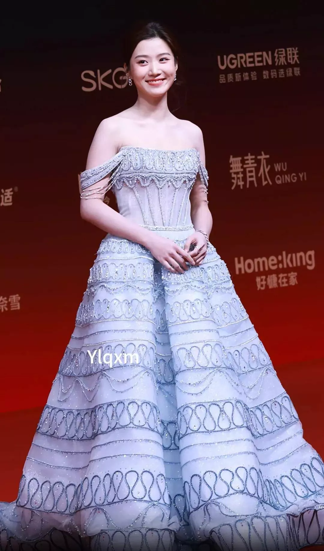 红毯造型时常被诟病的卢昱晓,这次总算选择了比较适合她的、清新一点的风格,是一条淡蓝色刺绣长裙,简简单单的礼服跟她清纯的气质比较契合,比那些有个性的时尚服饰更适合她。