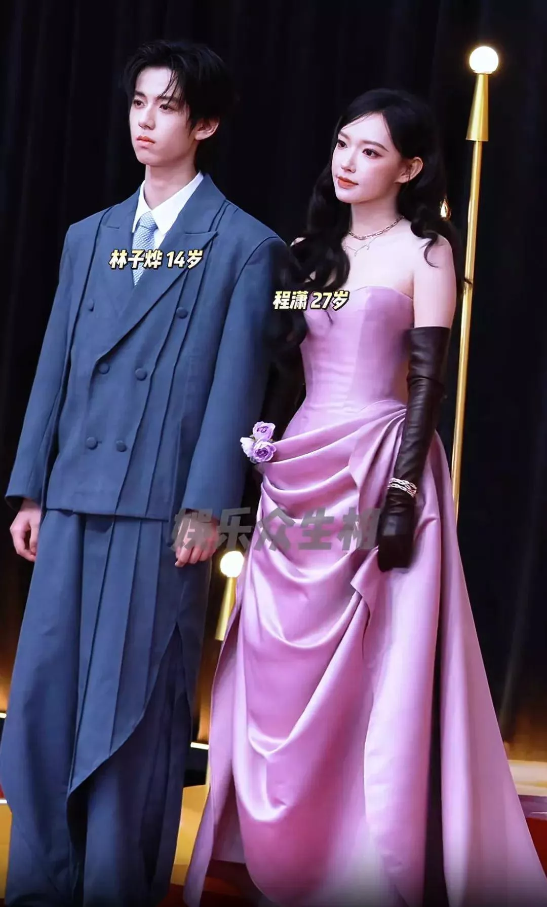 程潇穿了一条紫色礼裙搭配黑色长手套,高贵中带一点俏皮,很适合长相精致的她。在程潇身旁的是年仅14岁的林子烨,宽松的西服在他身上有种临时借了爸爸的西装来穿的既视感,毫无情绪的拍照表情仿佛在演绎生无可恋,看来他还无法分辨冷脸耍酷和面无表情的区别。