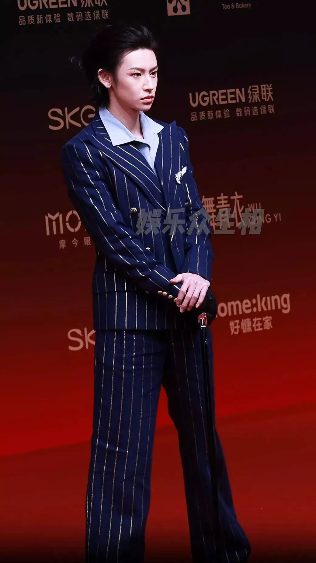 小鬼王琳凯难得没有打扮得个性十足,反而选择了常规一点的造型,这次他穿了一套蓝色条纹西装,搭配蓬松的大背头发型,也能凸显他酷的一面。