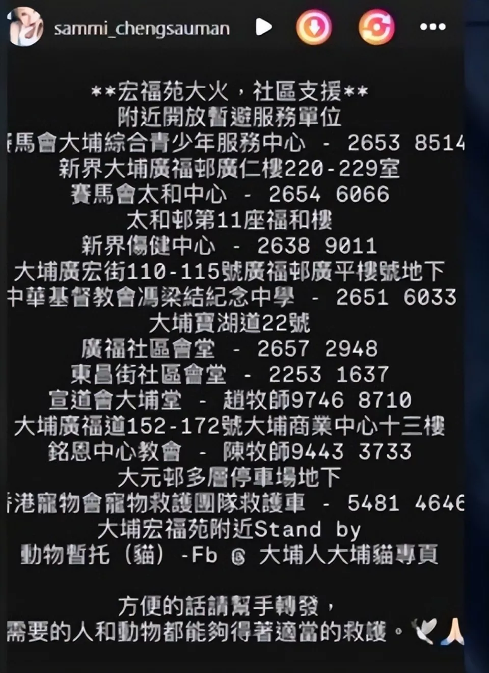鄭秀文在社交賬號發布社區支援資訊,並鼓勵大家進行轉發,讓有需要的人和動物們都能獲得救援。