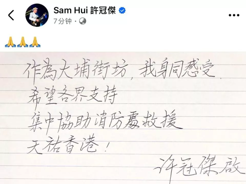 77歲的許冠傑寫了手寫信:「作為大埔街坊,我感同身受,希望各界支持,集中協助消防處救援,天佑香港!」看得人淚目。