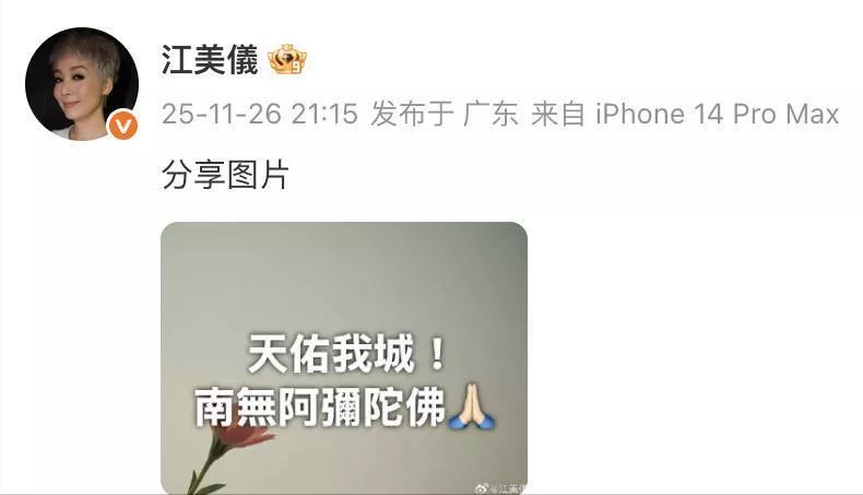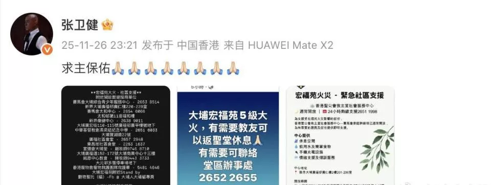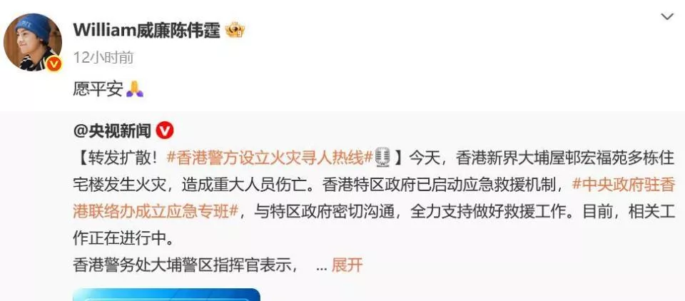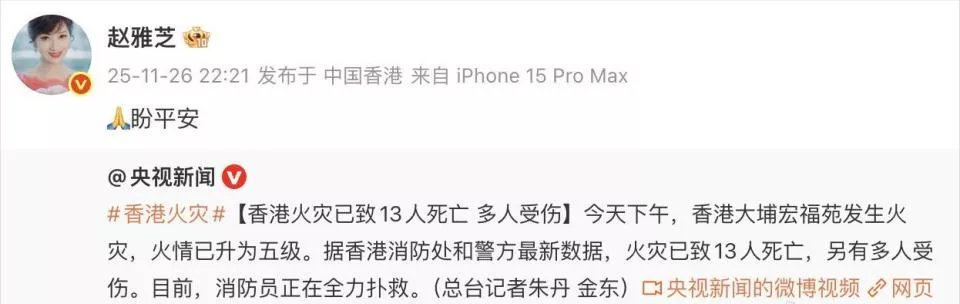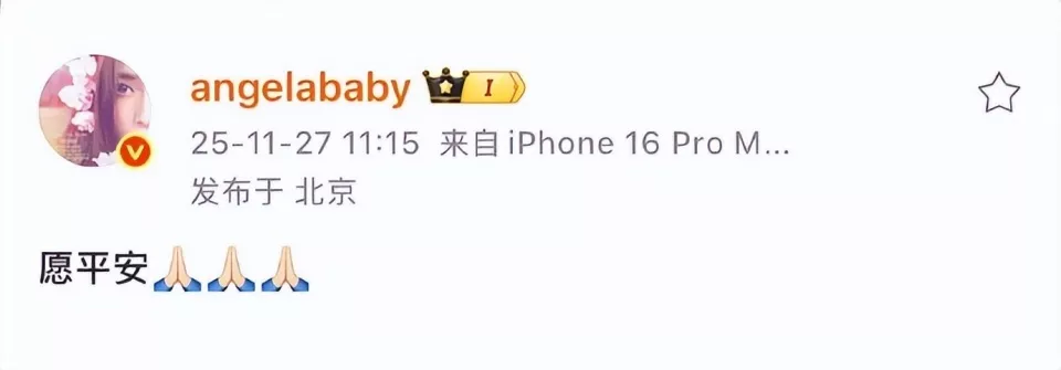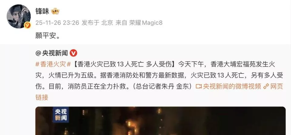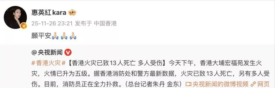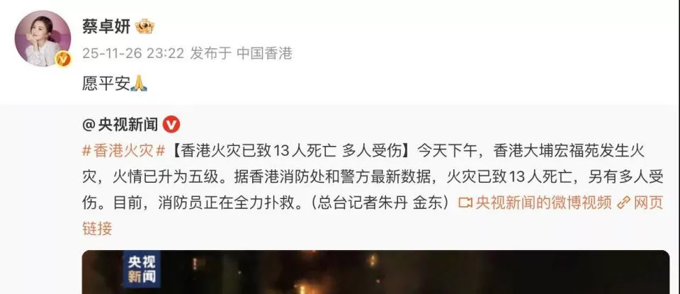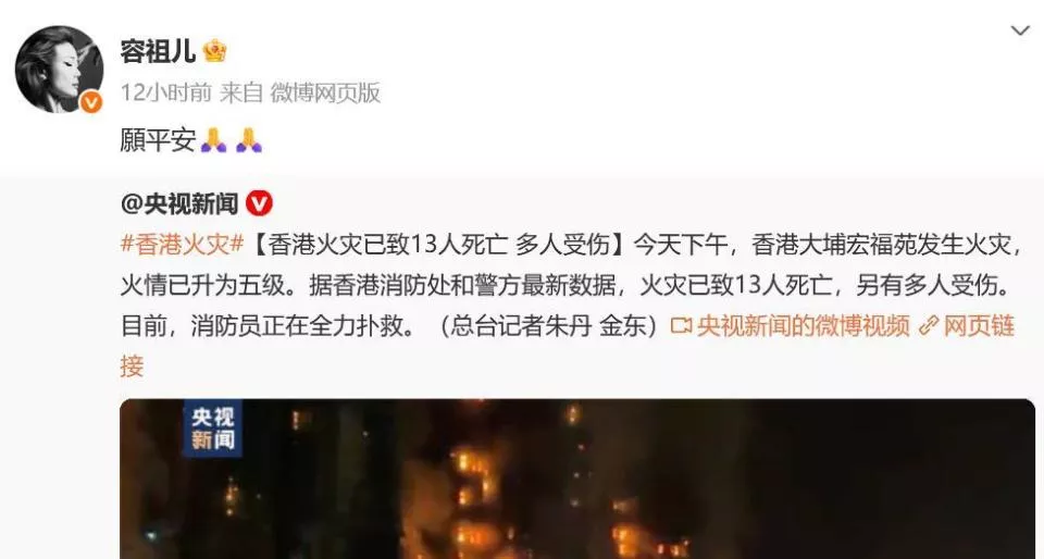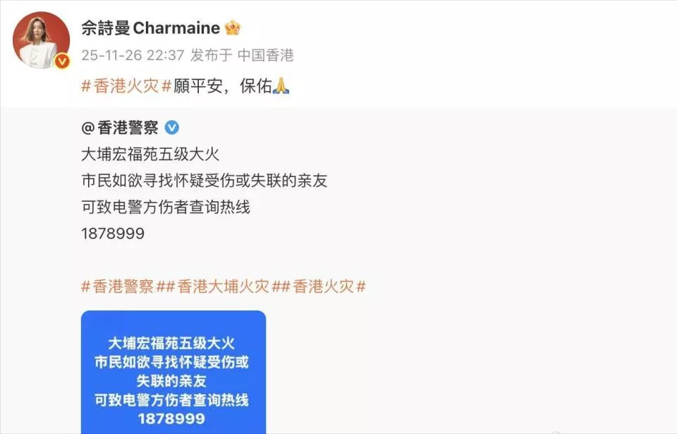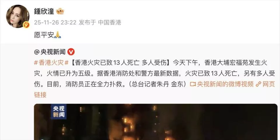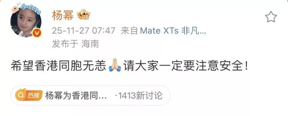 有家人在香港的楊冪同樣心系火災,27日一大早發文「希望香港同胞無恙,請大家一定要注意安全!」