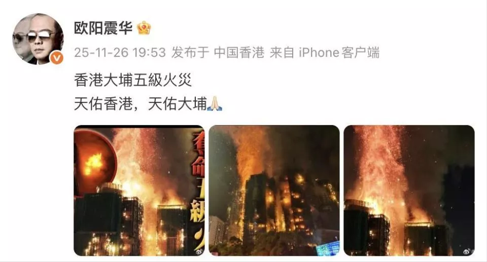 火災發生後香港各家傳媒將社交媒體頭像轉為黑白,娛樂圈的明星們也紛紛為受災民眾祈福。