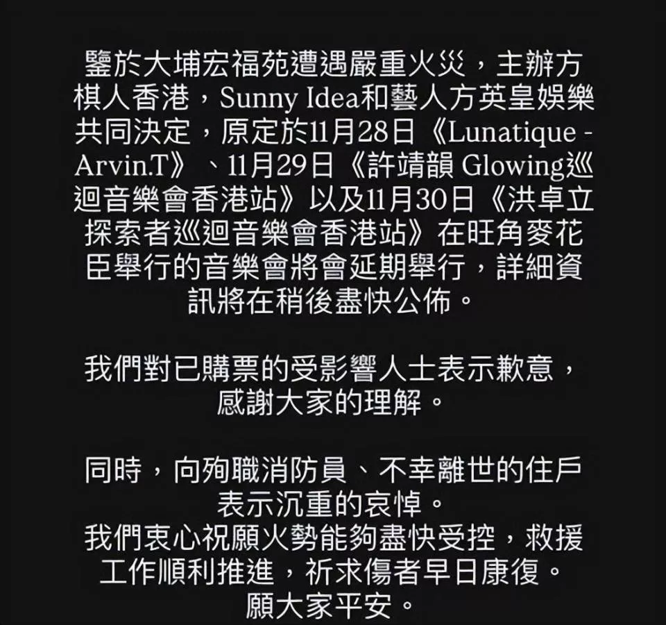 同時英皇公司宣布旗下藝人近期在香港的演唱會活動全部延期,並感謝大家的理解,希望救援工作順利推進,傷者早日康復。