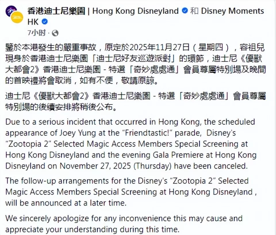 香港迪士尼也取消了《瘋狂動物城2》的香港首映禮,原本有容祖兒等藝人現身港迪與大家互動。