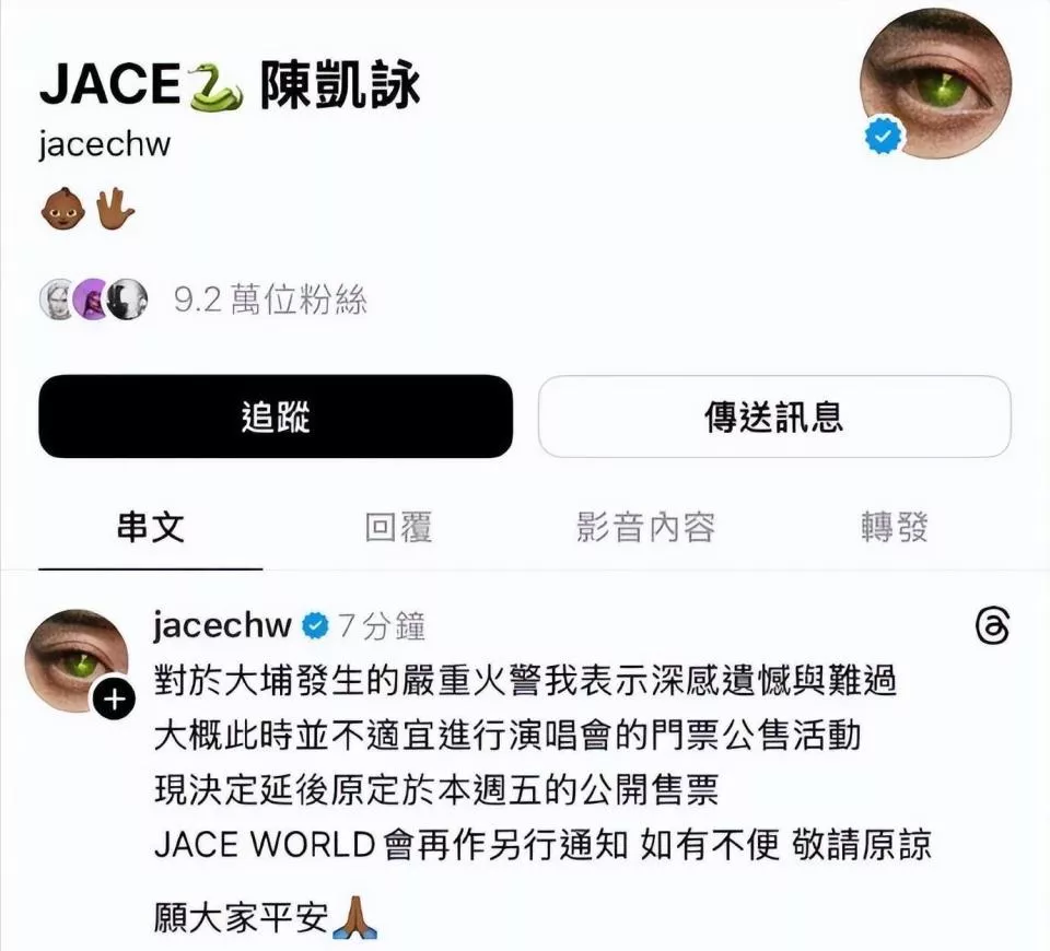 英皇旗下藝人謝霆鋒、蔡卓妍、阿嬌、容祖兒、陳偉霆等人也紛紛發文祈禱「願平安」。