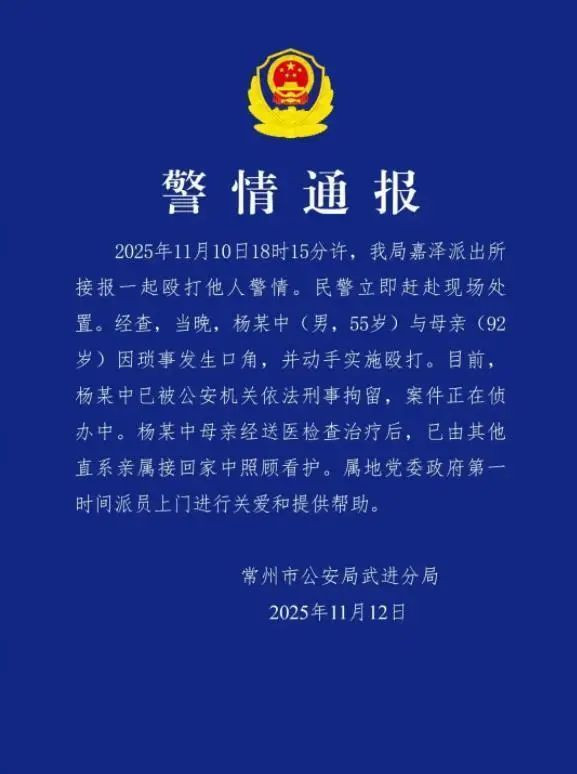 11月10日,流传在网上的一段视频显示,一名男子绕过桌子,一手拿着手机,另一只手对一位红衣白发老太太连续实施击打面部、揪头发、摇晃等,力度十分猛烈。老人难以躲避,接着发出“哎哟”叫声,并险些摔倒。随后,老人走到厨房,男子跟随过去,将老人推倒在地,并使劲按压。据江苏武进警方通报,杨某中已被刑事拘留。