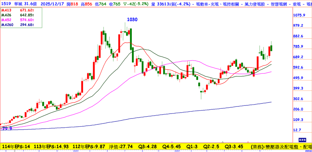 本周推荐的华城(1519)基本面相当亮眼,围绕「外销放量+超高压变压器升级+AI资料中心(AIDC)订单」三线并进,去年全年税后纯益42.86亿、年增约66%,EPS 14.93元创高。今年营收动能延续,Q3营收约64.49亿、税后纯益约10.9亿、EPS约3.45元;累计前三季税后纯益约27.41亿、EPS 8.68元,营收年增逾三成、续创同期高。