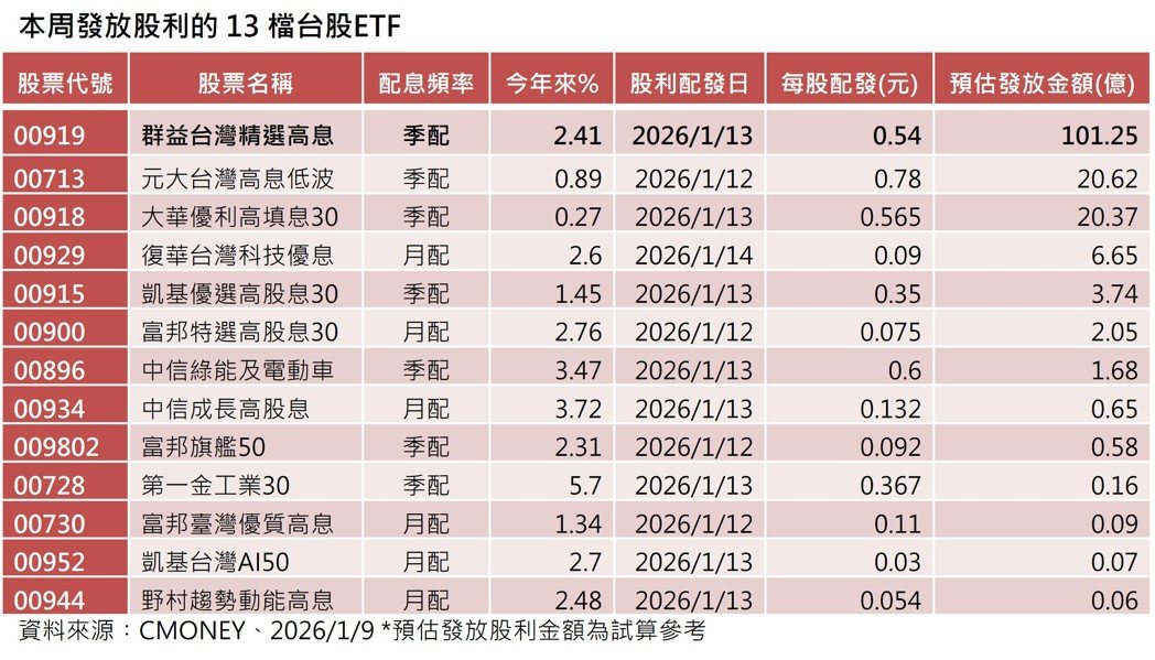 本周发放股利的13档台股ETF。(资料来源:CMONEY、2026/1/9*预估...