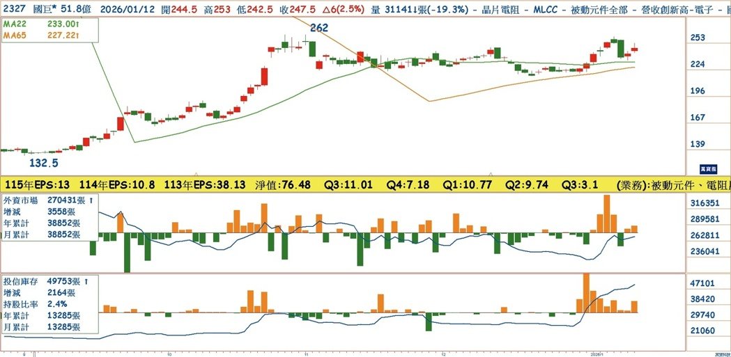 国巨2025年第三季毛利率攀升至36.19%,累计前3季EPS8.22元,全年EPS估11.5元,展望2026年,欧洲工控和车市将重返成长,加上AI伺服器之需求及终端产品之复苏,研判国巨业绩可望逐步回升,再搭配合并芝浦电子带来的综效,2026年受惠涨价,EPS上看15元,本益比17倍。