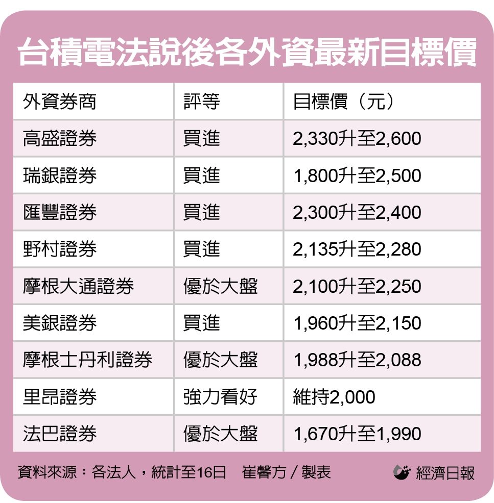 此外,摩根大通(小摩)、美银、摩根士丹利(大摩)、里昂及法巴,目标价分别落在2,250、2,150、2,088、2,000、1,990元,外资圈普遍看好台积电后市成长动能。