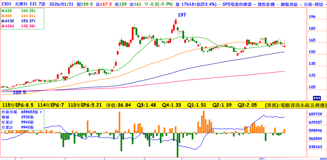 另一部门消费电子Q3营收164.57亿占36%、此部门含笔电、工作站、平板电脑、桌上型电脑、消费电子产品,尤其低轨道卫星电源表现特别强劲,由三部门看出成长幅度最大在与AI有关的云端,尤其在电源更具爆发力,去年Q4营收443.57亿只季减1.2%,又因辉达今年下半年切入RUBIN,使光宝展现爆发力,估今年EPS 8.5元,以1/21收161本益比只有18.9倍,严重低估。