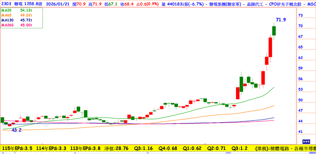 但市场从来都不笨的,外资从去年9月起开始买进联电的股票。那时候股价只有40.4元,外资持股为2,839,988张,到了今年1月20号,持股为4,120,437张。股价来到68.7元。
