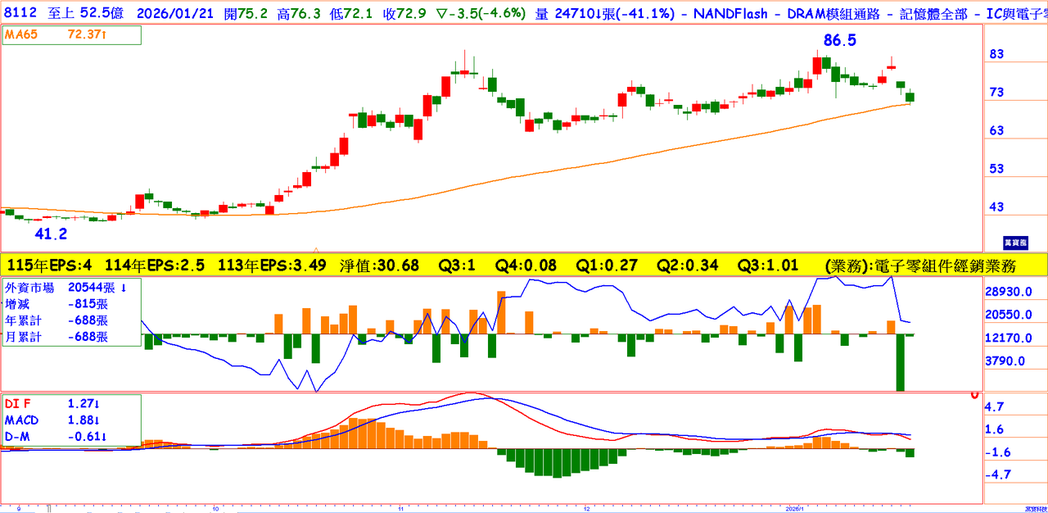 前3季EPS1.62元,2025年EPS上看3.6元,在记忆体报价持续看涨下,2026年EPS有机会挑战5~6元,本益比仅13倍,股价有被低估之嫌。股价力守上升趋势线,外资也默默吃货,加上MACD在零轴以上呈现多头趋势,建议趁短线美国商务部利空让股价拉回之际,可逢低分批布局。