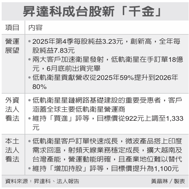 本土法人也看好升达科低轨卫星客户订单快速成长,今年第1季营收续创新高,且产业地位难以替代,2026年营收可望达46亿元,每股纯益可望达19元,维持「增加持股」评等,目标价提升为1,100元。 $(document).ready(function () {nstockStoryStockInfo();});