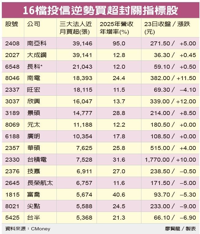 台股元月来频创新高,投信法人迄今却已连续卖超21个交易日,据悉,投信并非看坏台股,而是积极换股,留意投信这段期间逆势买超的台积电、南亚科(2408)、南电、欣兴及长荣航太等16档,有望成为蛇年封关前多头指标。