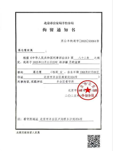 (维权网信息中心报道)2025年11月15日,本网获悉:北京人权捍卫者葛志慧女士于2025年11月11日22时被北京市公安局丰台分局以涉嫌寻衅滋事罪刑事拘留,目前羁押在丰台看守所。其案情尚不清楚。