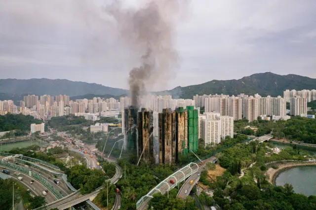 大埔區區議員梅少峰告訴BBC中文,涉事的宏福苑共有8座,全部都正在進行大維修,而當中有7座均受到大火波及,外牆棚架均受到嚴重焚毀,「最先起火的那一座樓,透過窗戶也看到裡面亦都有起火。」