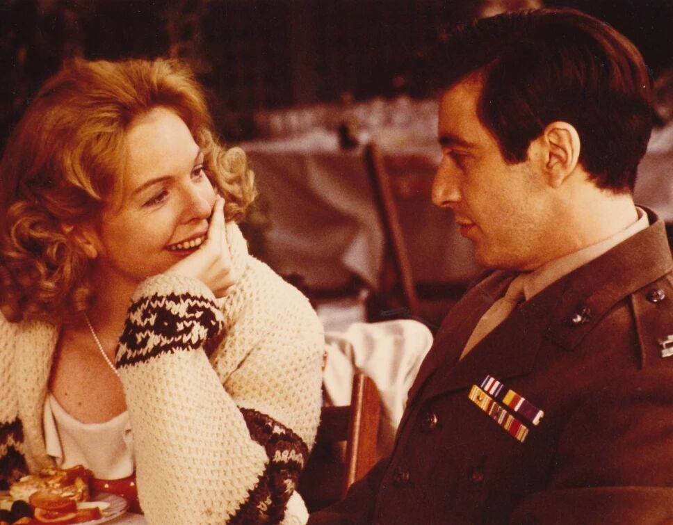 在《教父》三部曲中,戴安·基顿饰演凯·亚当斯,以温柔坚韧的形象为黑帮史诗注入人性温度,结局隔门凝望的无声表演被誉为影史经典。