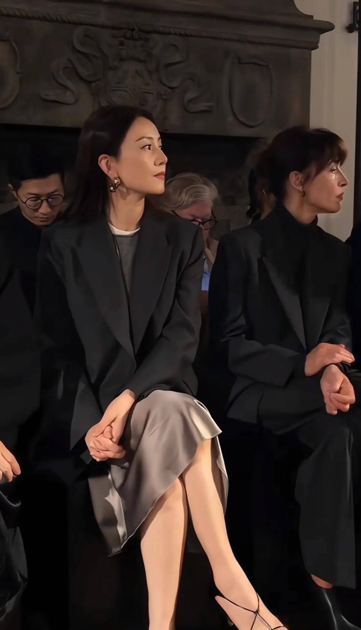 一袭黑白灰极简套装的女神,用教科书级的中长发卷发完成视觉定调。面料垂坠的西装裤勾勒出挺拔线条,而唇角自然上扬的弧度,比任何珠宝都耀眼。近距离特写里,她眼尾的细纹与苹果肌的光泽达成微妙平衡,那种被时光善待的松弛感,让人想起温养多年的羊脂玉。