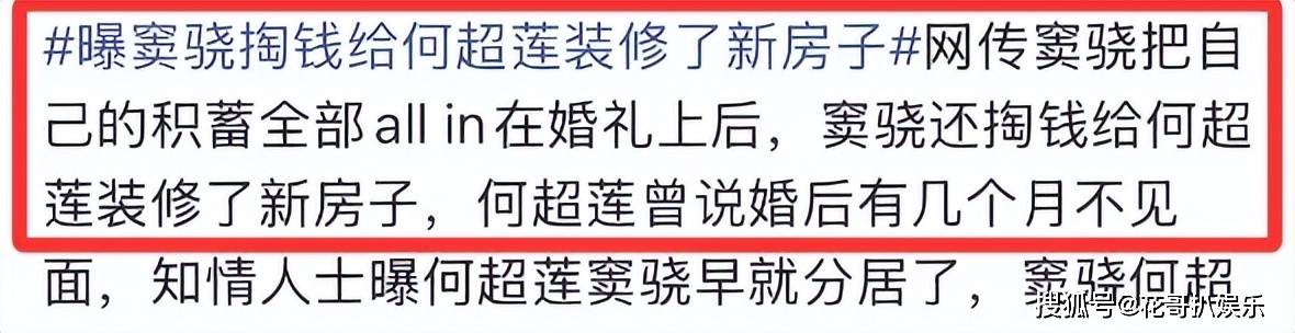 钱自然是很重要的,但两人突然撕破脸,还有一个原因。不知道大家记不记得,两人结婚办了婚礼不久,何超莲的闺蜜嘴上没个把门的,把小两口私密事吐露了出来,说何超莲之所以和窦骁结婚,是因为窦骁下面很大,很会伺候人,所以何超莲很满意。