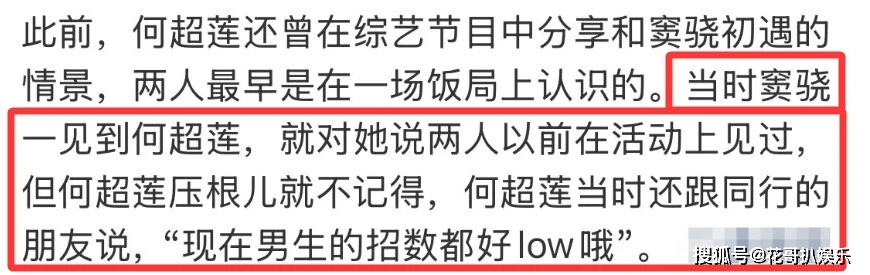 何超莲这边也没有闲着,直接把两人初见时的内幕露搂了出来。何超莲和窦骁是在一场饭局上,是窦骁主动找上何超莲搭话,可能是想拉近距离,找点话题,主动说他们之前见过一面,参加过同一场活动。尴尬的是何超莲根本不记得自己见过窦骁,甚至扭头就和同行的朋友吐槽,窦骁搭讪的招数实在是太low了。