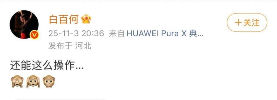 更让人费解的是,11月3日,白百何忽然在个人社交账号发文:“还能这么操作……”并配了捂眼睛、捂耳朵、捂嘴巴三个表情包,让更多网友忍不住前来深度“解读”。