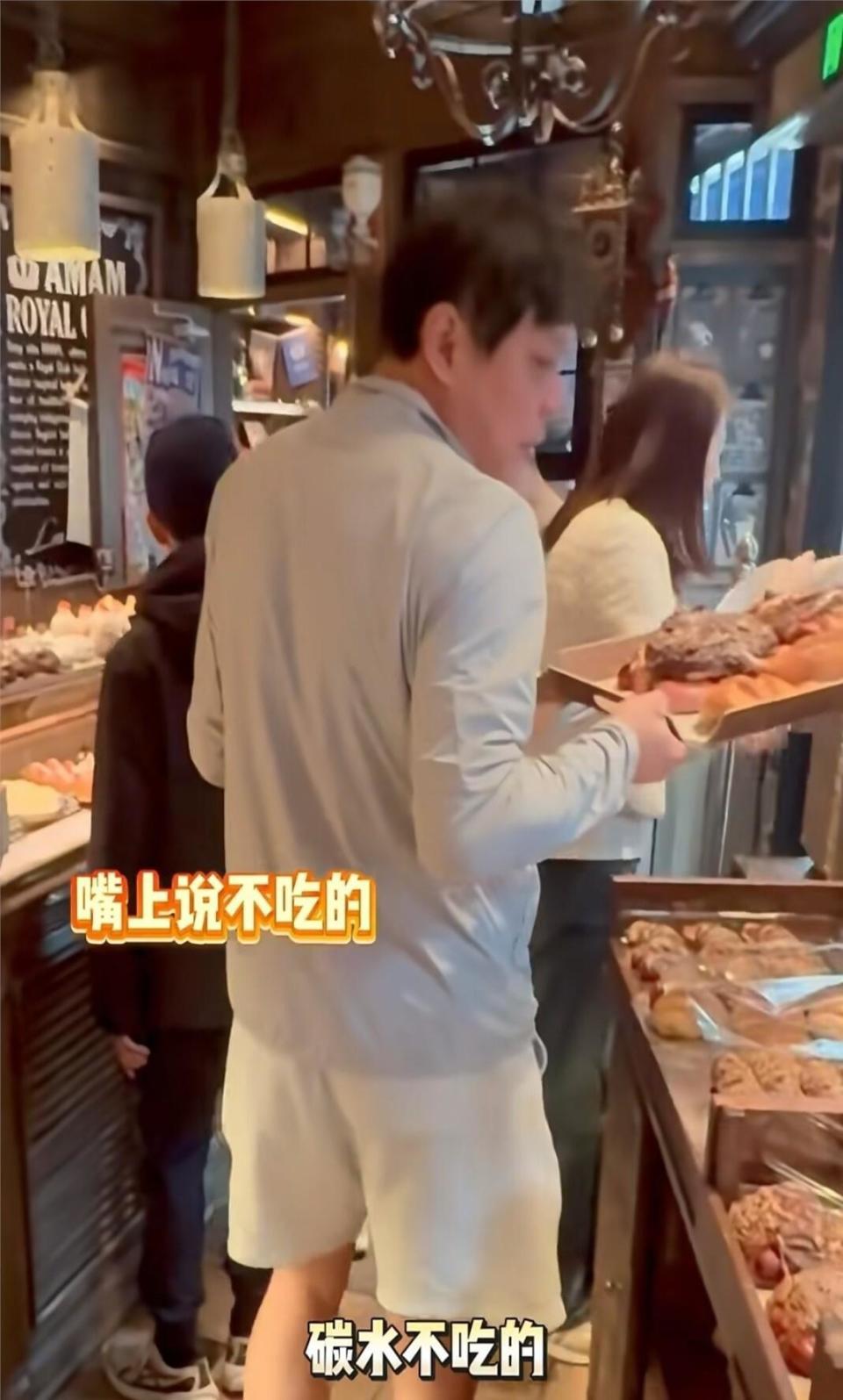 他盘子里堆满面包甜品,张梦瑾第一次提醒时他还偷偷添货,直到妻子皱眉加重语气,他立刻停手,眼神怯生生像犯错小孩。