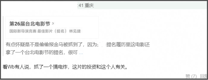 《家庭简史》是电影界新人作品,该片得到了柏林国际电影节、香港国际电影节、台北电影节国际新导演竞赛、北京电影节等的青睐,纷纷入围,其中获得了最受瞩目导演及艺术贡献两个大奖,前途不可限量。如今被金鸡奖除名,有网友根据其入围了台北电影节信息猜测片方是不是偷偷报名了某劣迹奖,触及了底线。