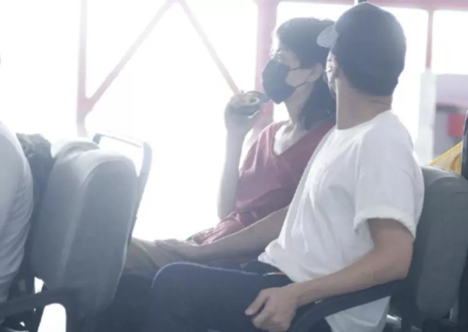 在摆渡车上甜蜜相依。