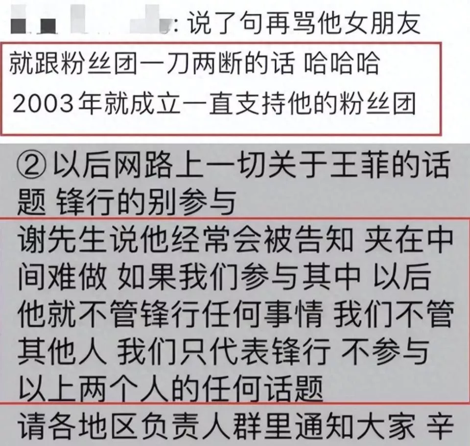 原来是谢霆锋的粉丝在网上骂王菲,谢霆锋看见了就亲自打电话给粉丝团的负责人,表示如果再这样他就跟粉丝团一刀两断,实力维护王菲。