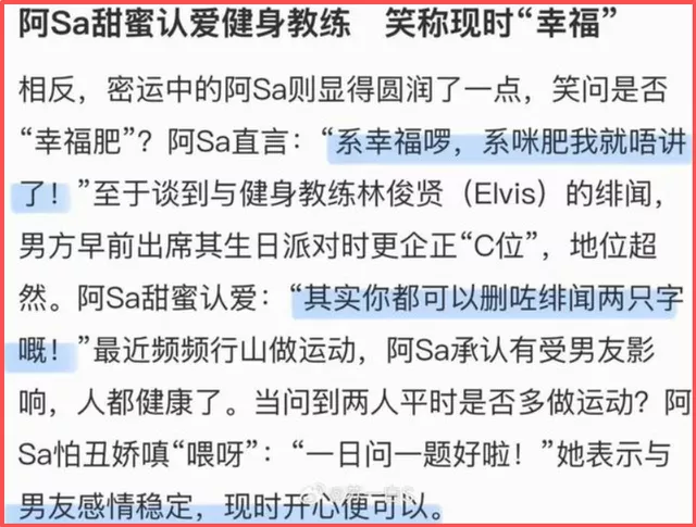阿Sa热爱运动,长期坚持健身,与身为顶级私教的林俊贤日久生情,实在是再自然不过的事情。对方年轻、健康、拥有积极的生活状态,在同一频率上相处,产生感情有什么难以理解的呢?