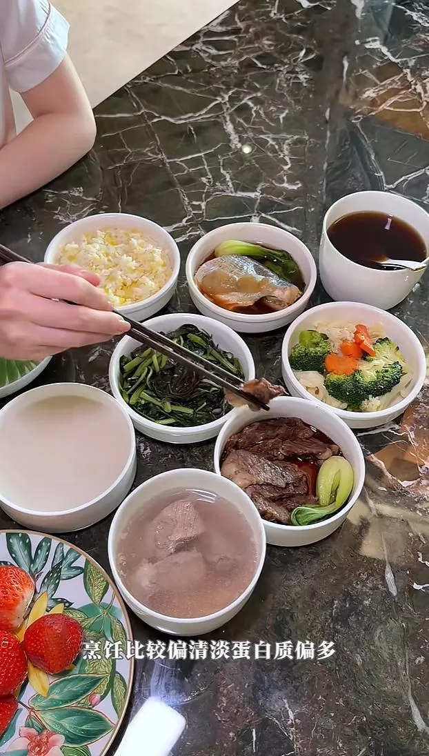 饮食上马筱梅吃的也比较科学,鱼肉、牛肉搭配西兰花和其他绿叶菜,另外还有滋补的汤,整体上是以高蛋白和补充营养为主的。