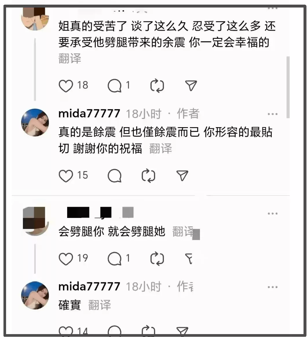 对于mida个人,她被林俊杰官宣恶心也是因为看到了全家福合照,同样的照片她也有但从未被承认,结果劈腿的人官宣了,确实会让人不舒服。所以她恨极了被劈腿,认同“会劈腿你,就会劈腿她”的说辞。
