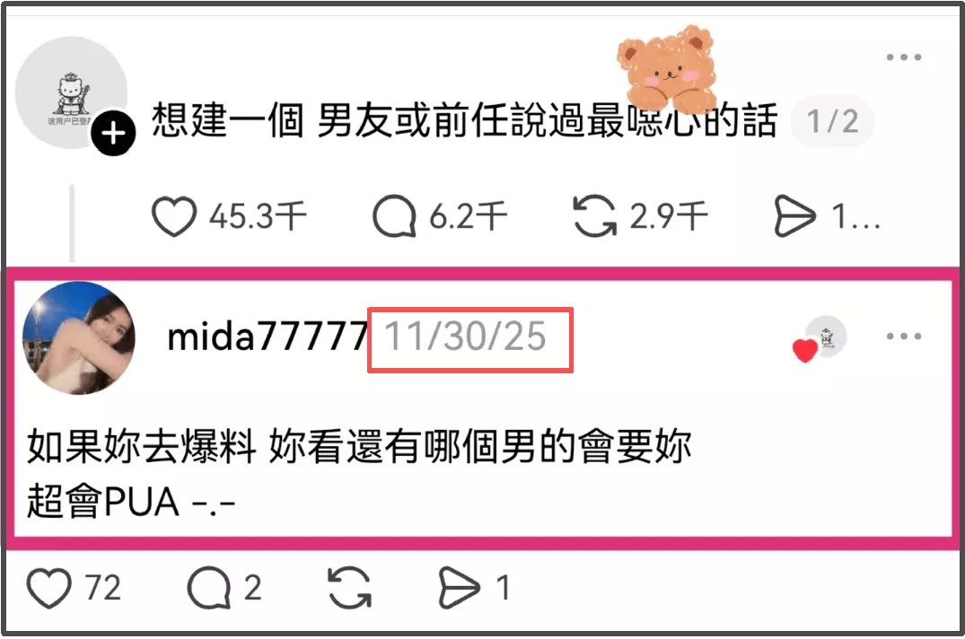 顺着mida的社媒发言,还能看到她去年11月底的吐槽,表示前任说过最恶心的话是“如果你去爆料,你看还有哪个男的会要你,超会pua”,从交往时间线来看,基本上就是吐槽林俊杰了,不然她不会默默隐身好几年。清醒回头看,这句话不仅是威胁,还有严重的男凝,把女性价值建立在男性需求上。