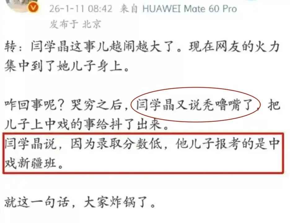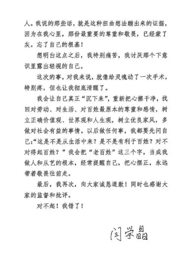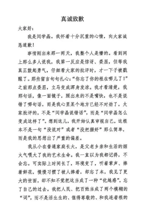 沉默多日的闫学晶,在朋友圈发了一则篇幅不短的道歉信,她承认自己忘了本。