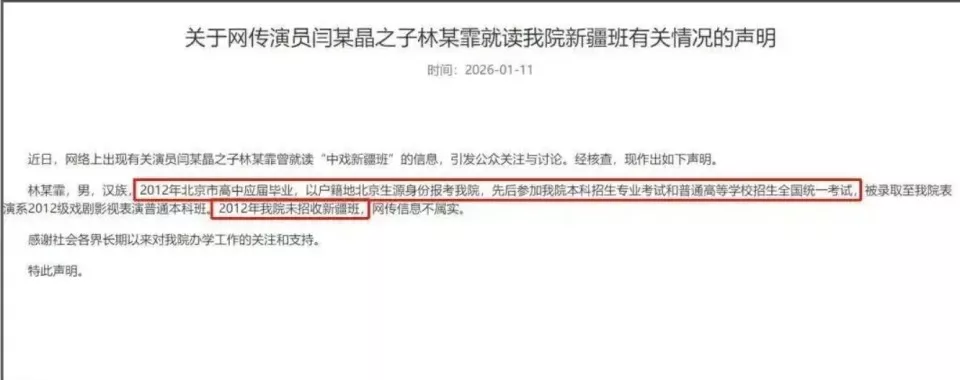 声明中称,林傲霏当年是以北京生源身份正常考入的中戏,并且表示当年并未招收新疆班。
