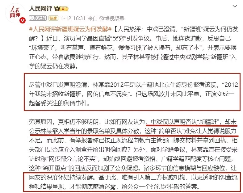 还提到中戏只是在声明中否认了“新疆班”,但是并没有公示林傲霏当年的录取分数和名单。