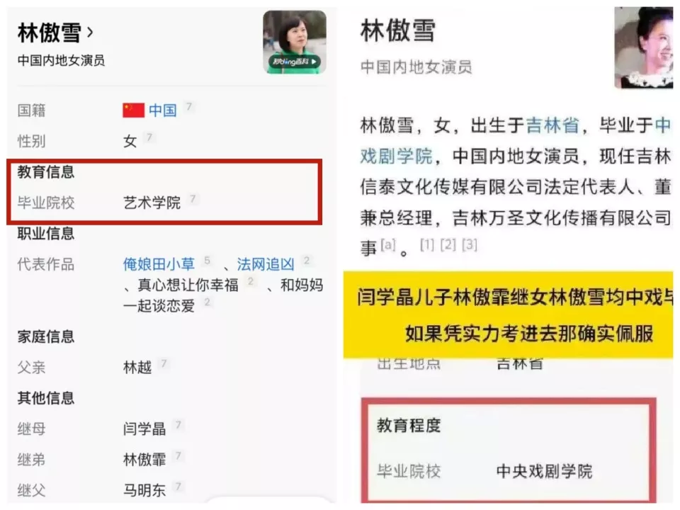 有人发现,她的继女林傲雪竟然也是中戏毕业,还出演过闫学晶主演的电视剧《俺娘田小草》。